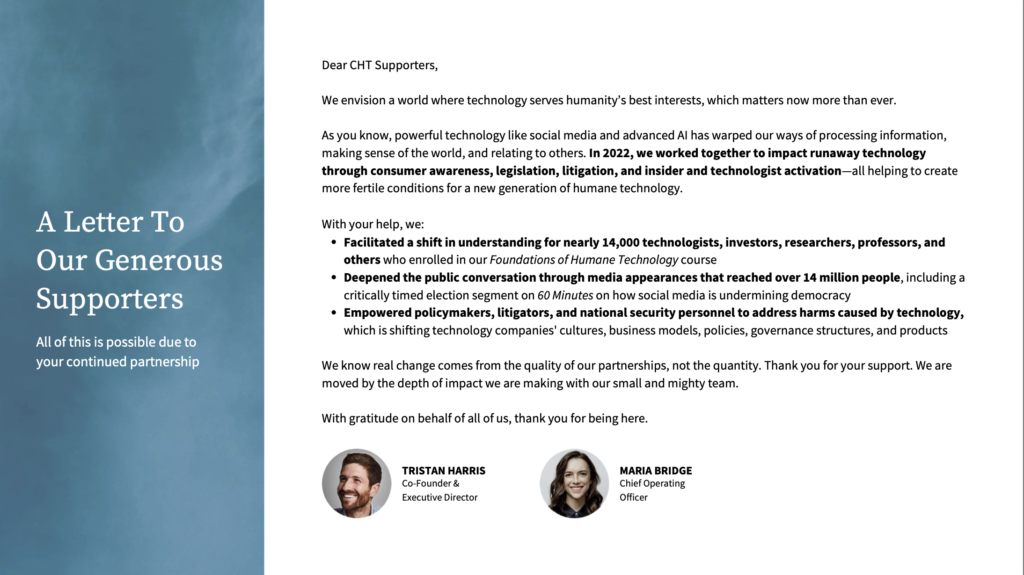 The CHT’s website’s About Us page has a section that highlights the impacts the organization has made in the last year. The goals and accomplishments for the year 2022 demonstrate how the nonprofit focuses on and promotes the well-being of individuals and the ethical uses of AI. One of the accomplishments includes engaging in consumer awareness, legislation, and litigation to lay the groundwork for a new generation of humane technology.
